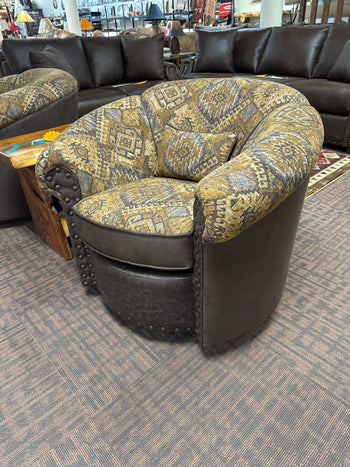 The Barrel Glider is proudly hand built in America! These swivel, and glide. Limited lifetime warranty included. Hundreds of colors to choose from and "hair on hide" cowhide and tooled leather accents options available. Pillow included. Dimensions = 39”wide x 37.5” deep x 32” tall Cow hide colors will vary. Availability = Normally an in stock it...
